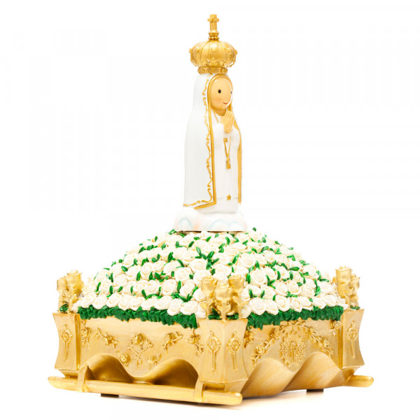 • Estatueta religiosa da Virgem Maria com vestido branco e detalhes dourados sobre base dourada com rosas brancas e folhas verdes.