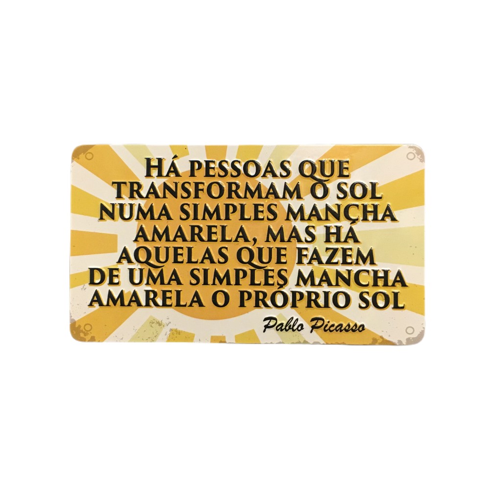• Placa decorativa em metal com citação de Pablo Picasso sobre o sol em amarelo e branco