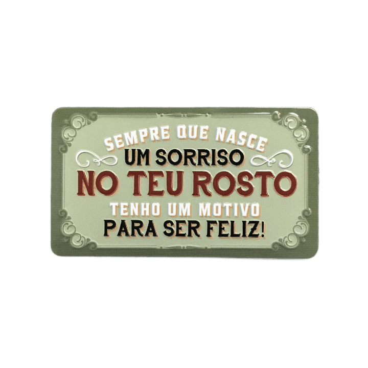 Íman Retro MMP 085 - Sempre que nasce um sorriso no teu rosto tenho um motivo para ser feliz! 4,95 € Desconto de %. Partilhar O produto encontra-se sem stock. Íman com design de inspiração retro. Mensagem inscrita"Sempre que nasce um sorriso no teu rosto tenho um motivo para ser feliz!". Medidas: 10x5,7 cm. Tags PresentesÍman Características