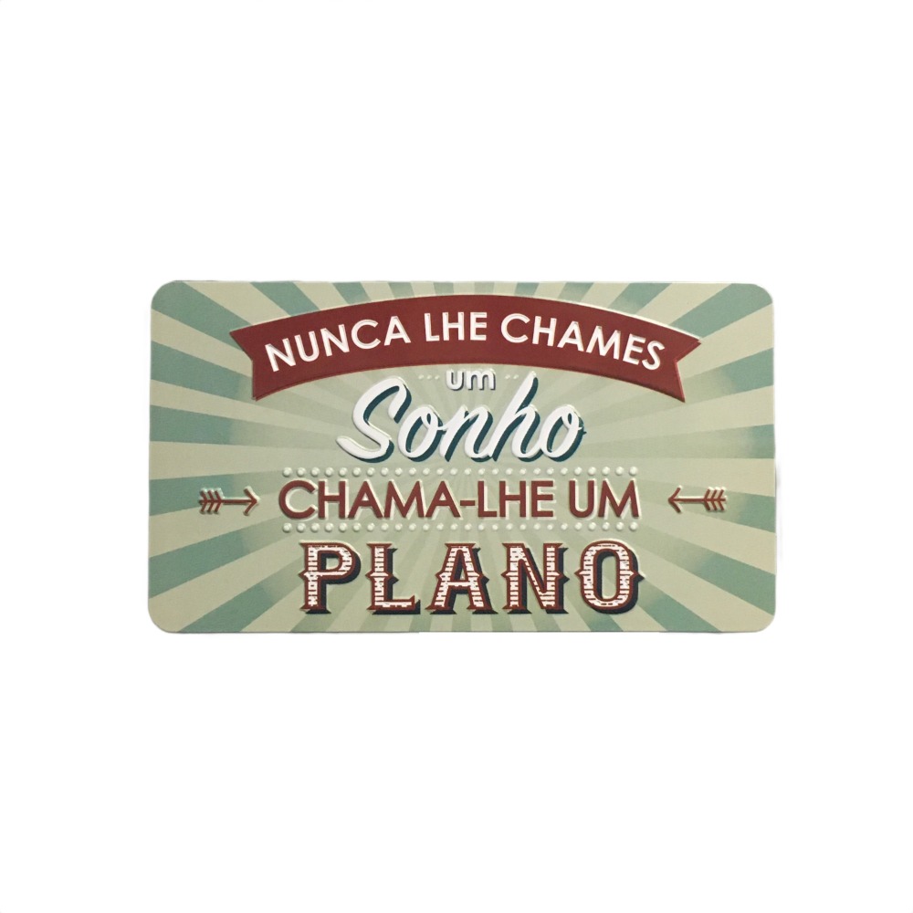 Íman Retro MMP 155 - Nunca lhe chames um sonho, chama-lhe um plano 4,95 € Desconto de %. Partilhar Comprar Contactar SKU: ZF120255 Íman com design de inspiração retro. Mensagem inscrita"Nunca lhe chames um sonho, chama-lhe um plano" Medidas: 10x5,7 cm. Tags PresentesÍman Características