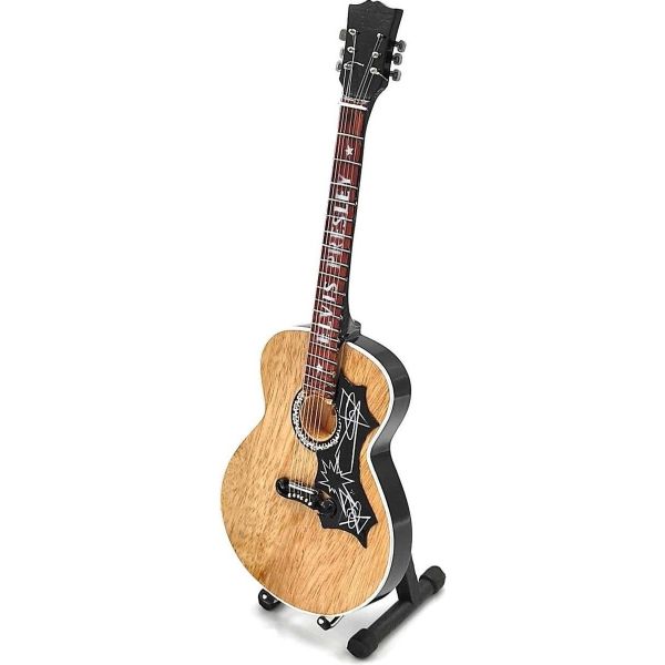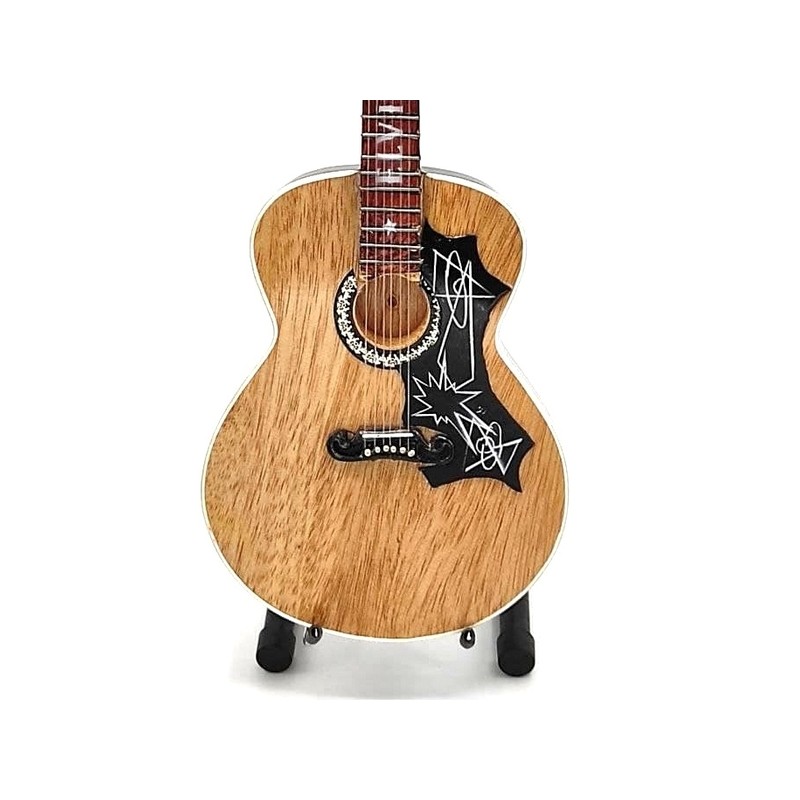 • Guitarra acústica de madeira clara com detalhes pretos e brancos num suporte preto