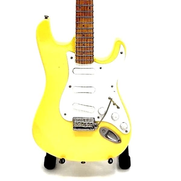 • Guitarra elétrica amarela com detalhes brancos e metálicos em suporte preto