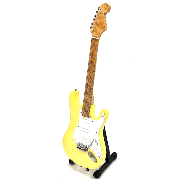 • Guitarra elétrica amarela com braço de madeira em suporte preto