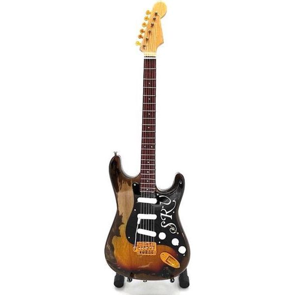 • guitarra elétrica castanha e preta com texto SRV no escudo