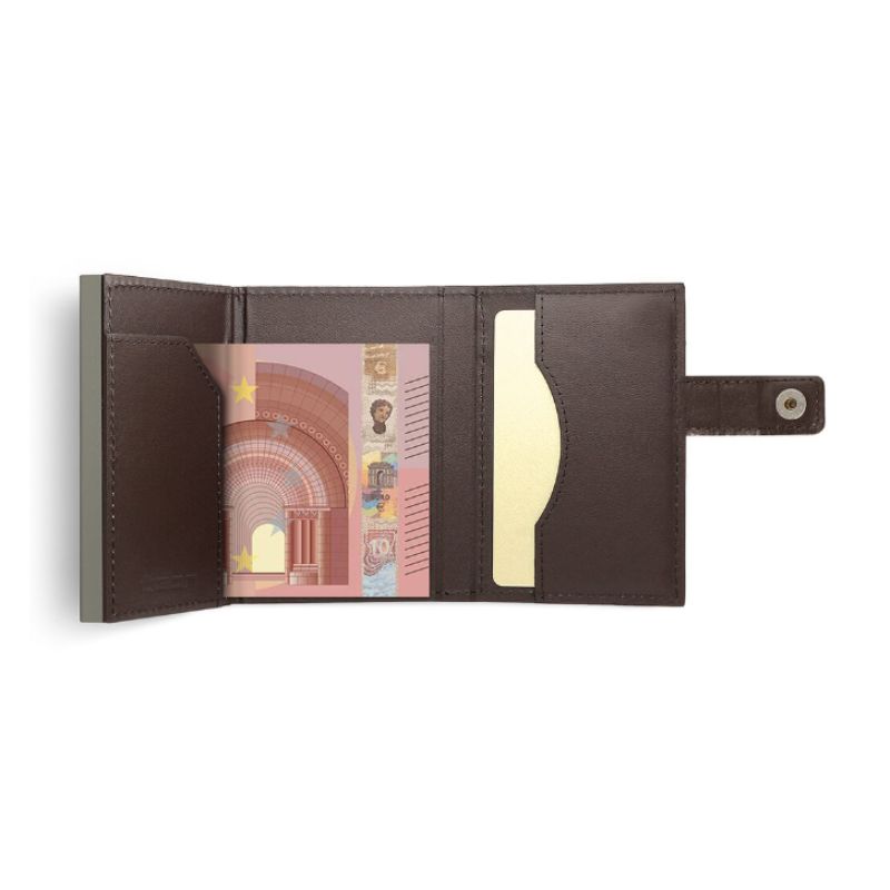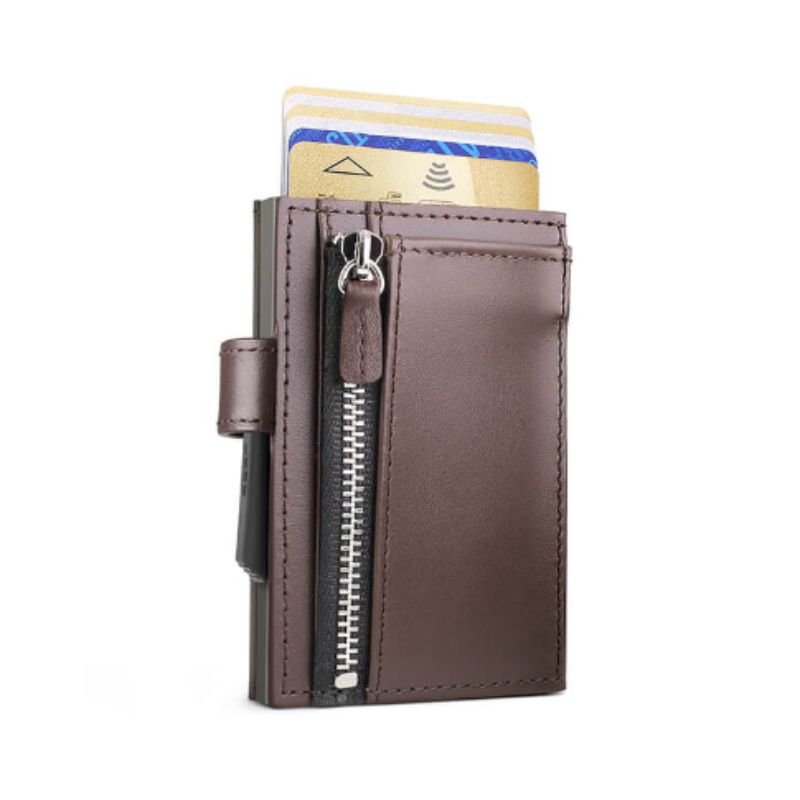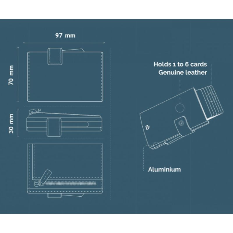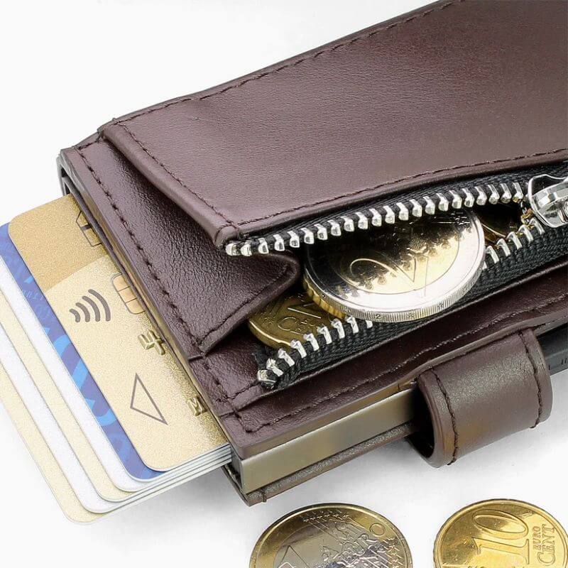 Carteira automática/porta-cartões em alumínio e couro genuíno.