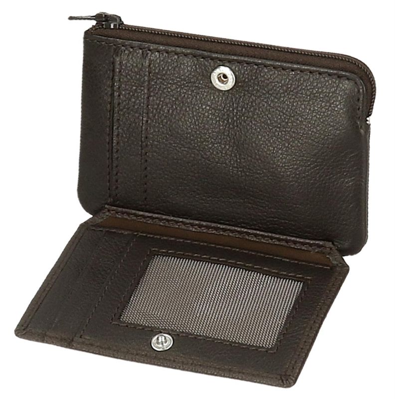 • Possui um compartimento com fecho-éclair para moedas e outro compartimento com fecho de clique com quatro ranhuras para cartões e uma para cartão de identificação.