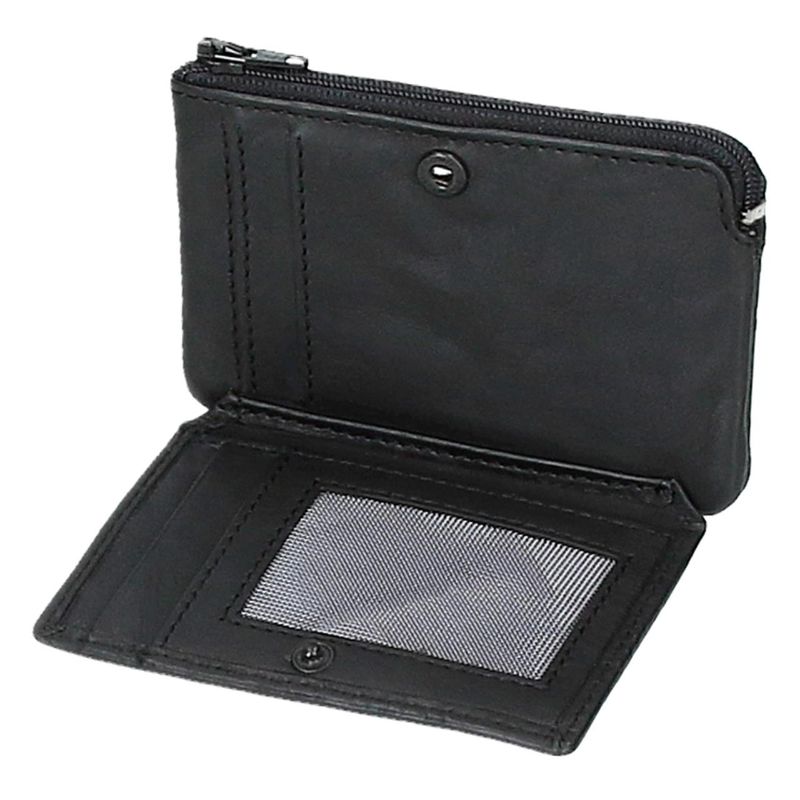 • Possui um compartimento com fecho-éclair para moedas e outro compartimento com fecho de clique com quatro ranhuras para cartões e uma para cartão de identificação.