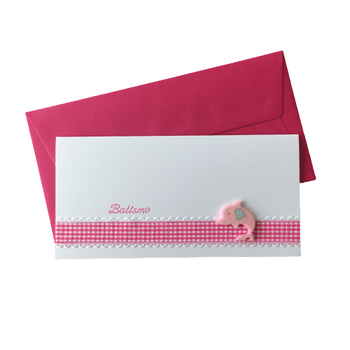 • Convite branco com faixa xadrez vermelha e branca e detalhe rosa de carrinho de bebé, envelope rosa