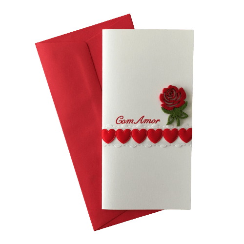 • Cartão branco com decoração de rosa vermelha e corações acompanhado de envelope vermelho