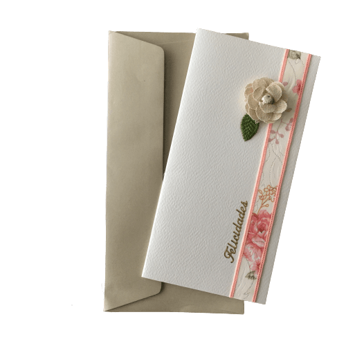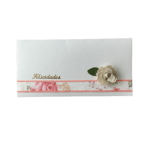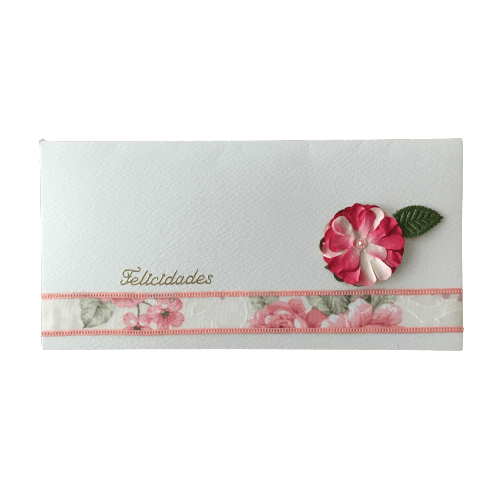 • Envelope branco decorado com faixa floral, flor de tecido e texto 'Felicidades'