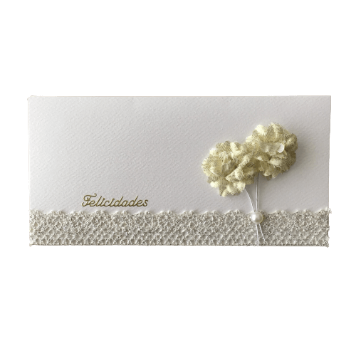 • Envelope branco decorado com renda bege, pompons creme e texto 'Felicidades' em dourado