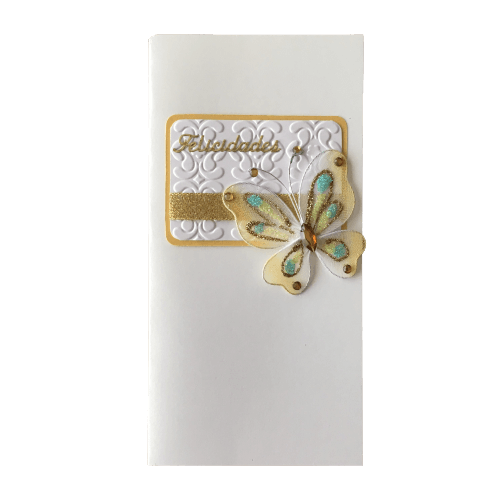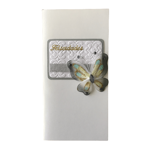 • Cartão branco com relevo, texto 'Felicidades', fita prateada e borboleta decorativa azul e dourada