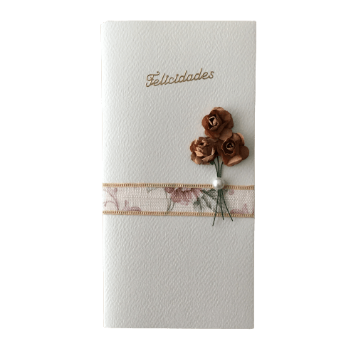 • Envelope branco com palavra FELICIDADES e decoração de flores castanhas e faixa floral