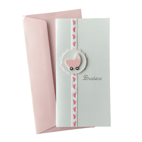 • Cartão de felicitações branco com carrinho de bebé rosa e envelope cor de rosa