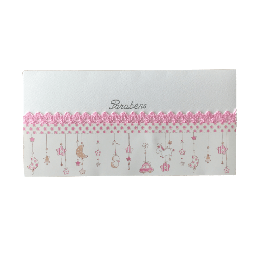 • Envelope branco decorado com renda rosa e padrões suspensos cor-de-rosa e dourados, com texto 'Parabéns'