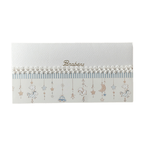 • Envelope branco decorado com padrão infantil e palavra 'Parabéns'