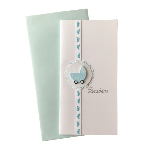 • Cartão branco com carrinho de bebé azul e envelope azul claro