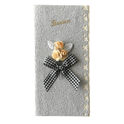 • Cartão cinzento decorado com rosas amarelas, laço xadrez preto e branco e 'Parabéns' em dourado