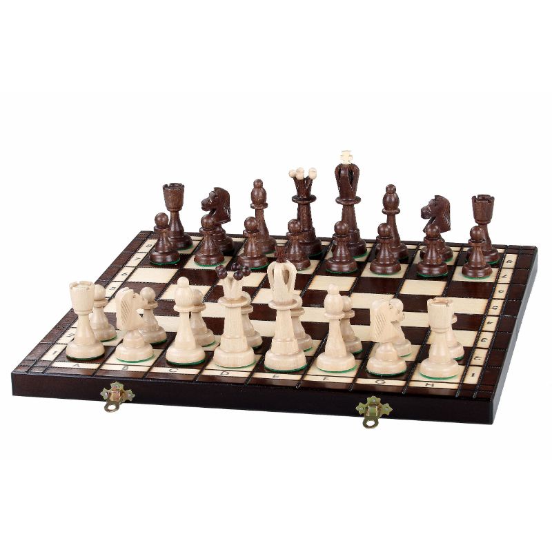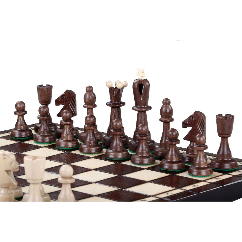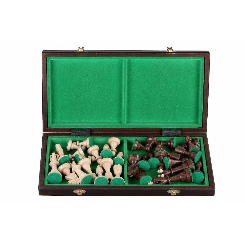 Este é um xadrez popular graças ao design clássico das suas peças. Um tabuleiro de xadrez dobrável levemente ornamentado que possui dois compartimentos com forro de feltro para o armazenamento das peças no interior.