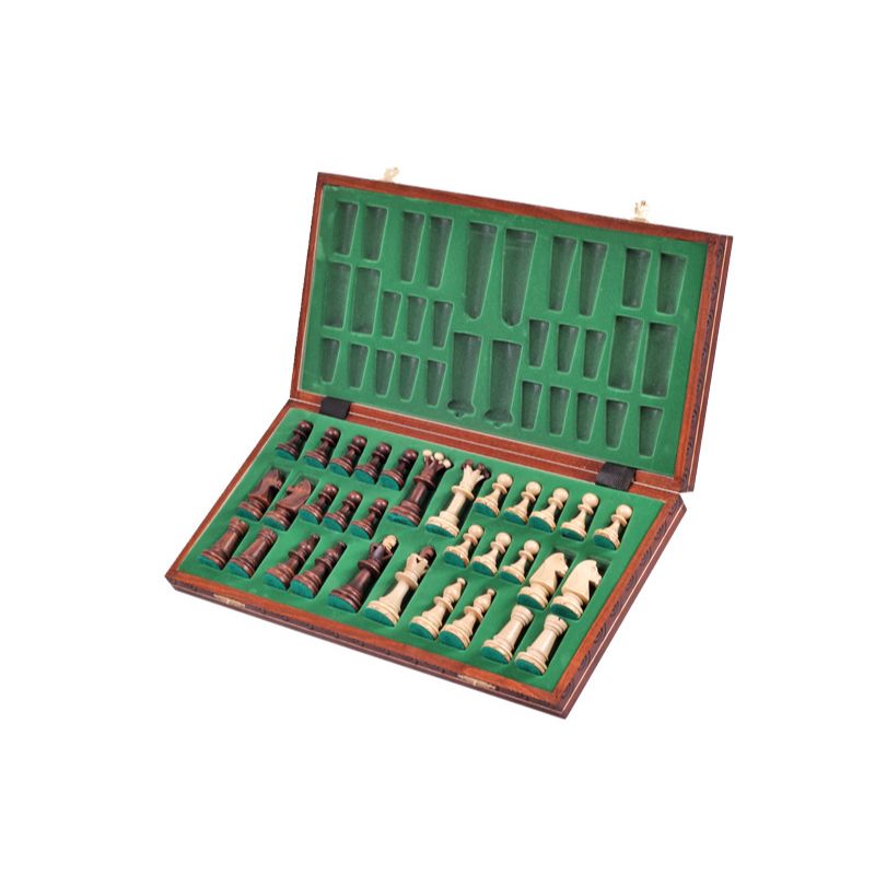 • Conjunto de xadrez em caixa de madeira forrada a tecido verde com peças castanho escuro e bege claro