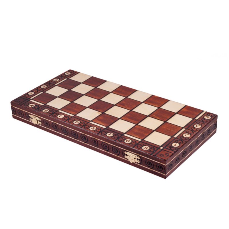 • Tabuleiro de xadrez em madeira dobrável com padrão quadriculado e fecho metálico
