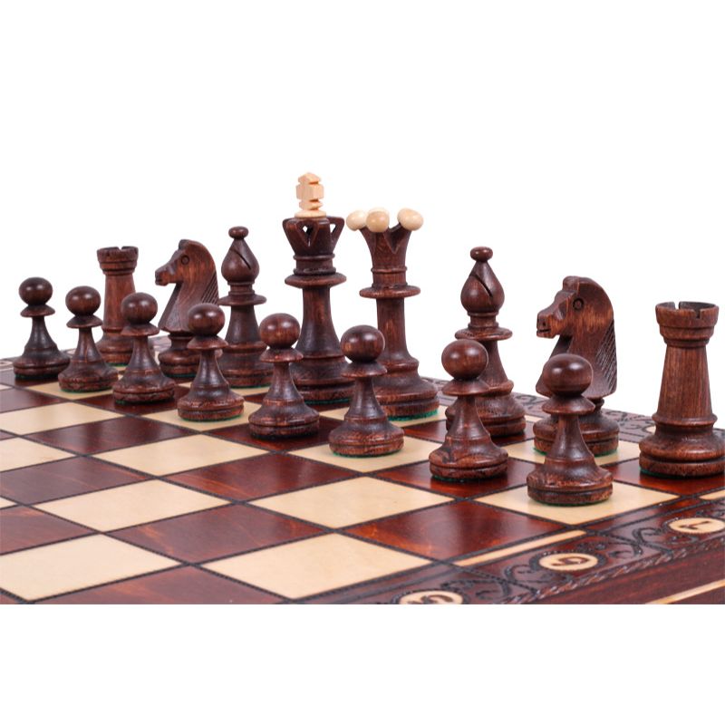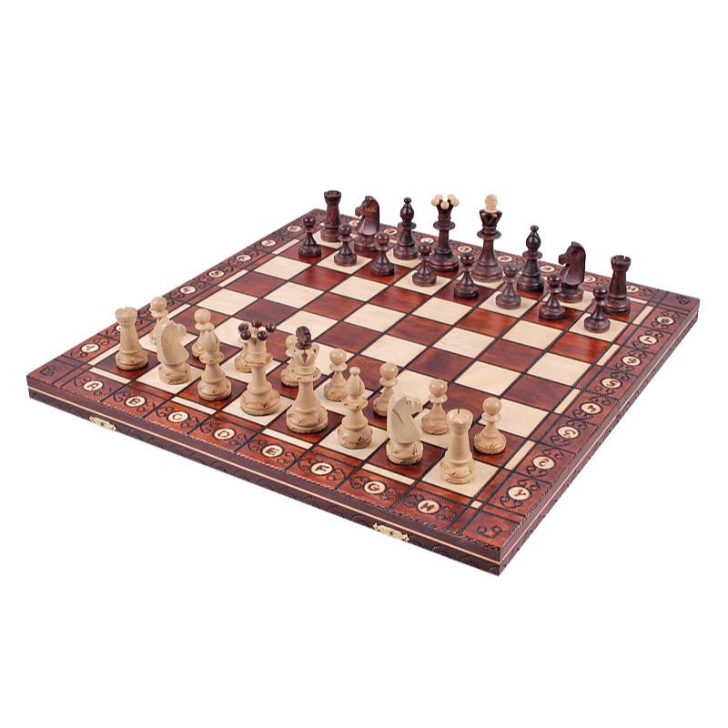 • Jogo de xadrez em madeira com peças claras e escuras sobre tabuleiro decorativo em madeira.