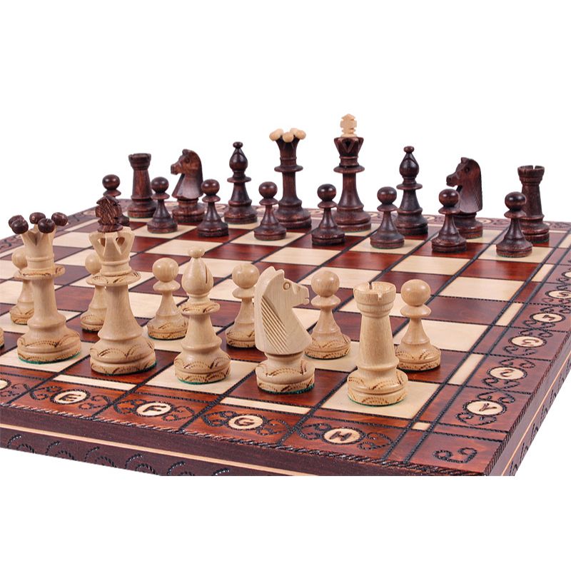 • Tabuleiro de xadrez em madeira com peças alinhadas, bordas decoradas e numeração