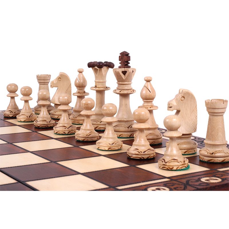 • Peças de xadrez em madeira clara sobre tabuleiro de xadrez de madeira decorado