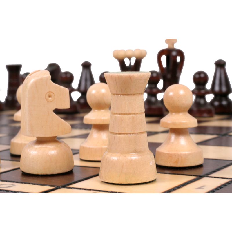 • Tabuleiro de xadrez de madeira com peças claras e escuras