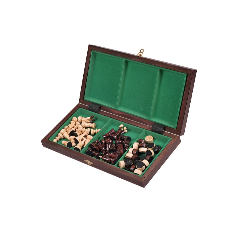 Tabuleiro de xadrez e damas dobrável, com espaço para armazenamento das peças no interior.