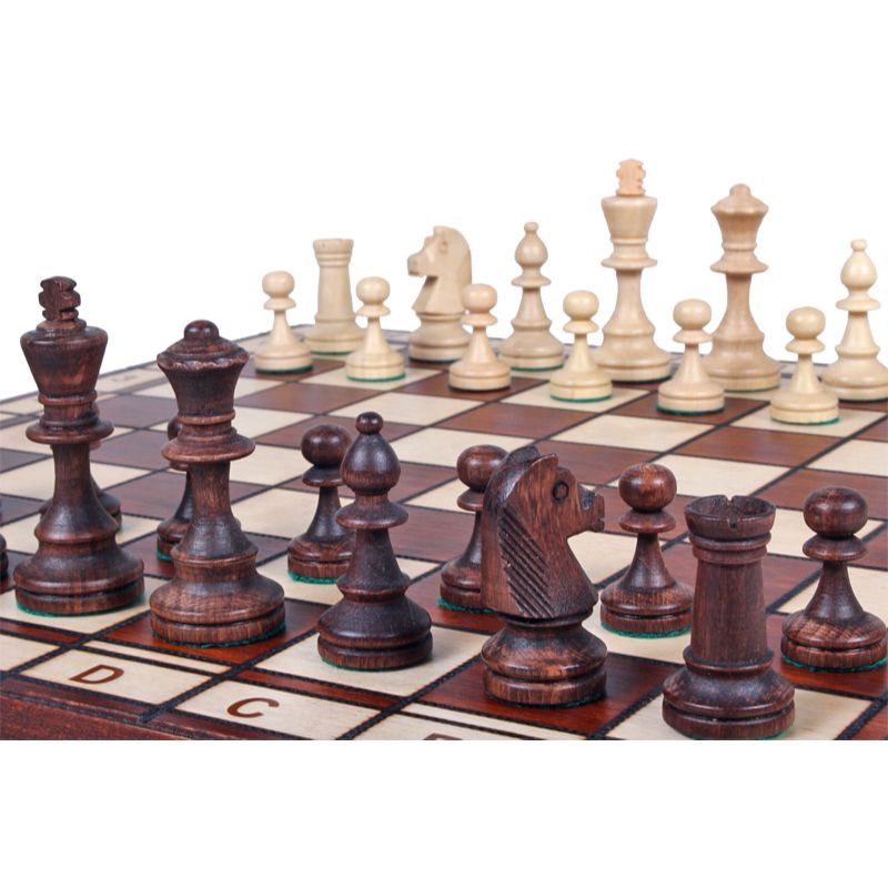 • Tabuleiro de xadrez em madeira com peças claras e escuras e marcações alfanuméricas.