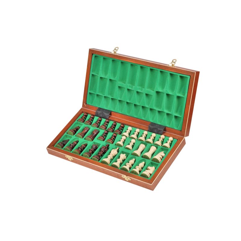 • Conjunto de xadrez com peças bege e castanhas em caixa de madeira com interior verde