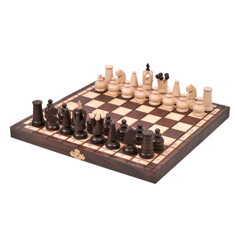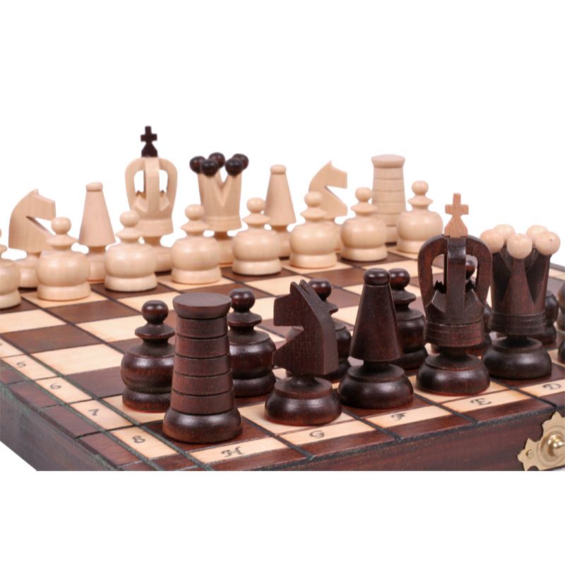 • Conjunto de xadrez em madeira com peças claras e escuras num tabuleiro quadriculado.
