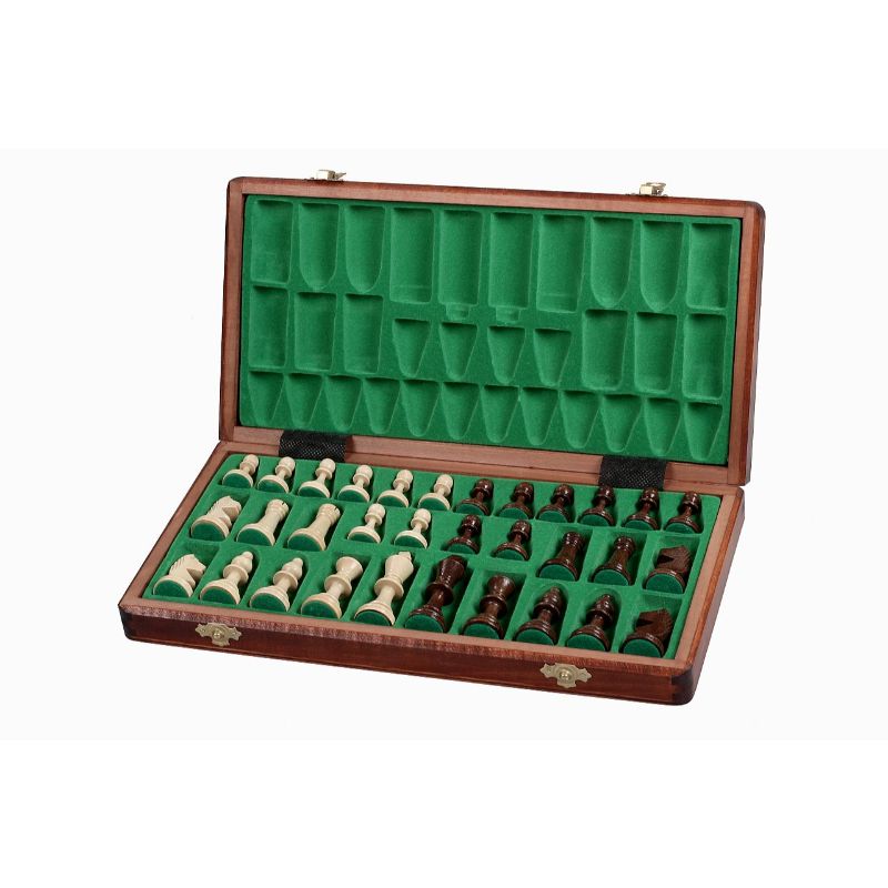 Tabuleiro de xadrez dobrável, com espaço para armazenamento das peças no interior.