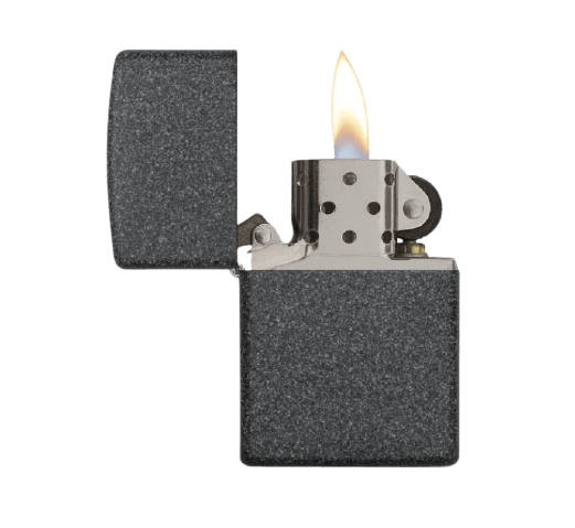 • Isqueiro metalizado cinza escuro com tampa aberta e chama acesa