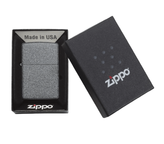 • Isqueiro Zippo cinzento numa caixa preta com texto e logótipo